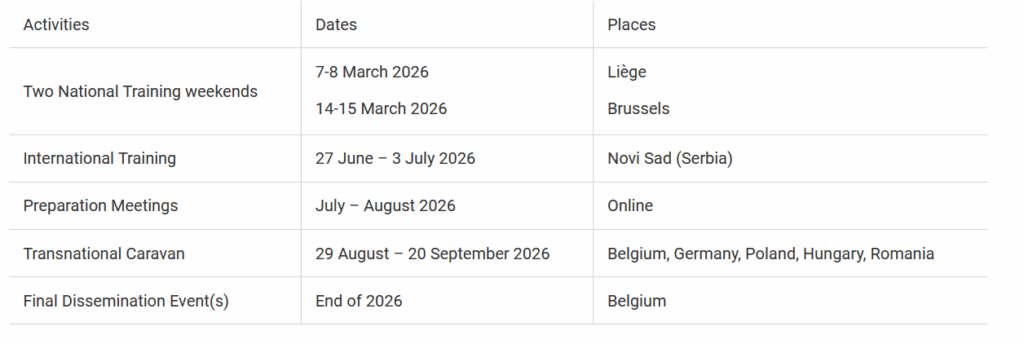 Activities Include: two training weekends, the stop of the travelling Caravan in Liège, participation in the development of an online campaign and at least one local event.