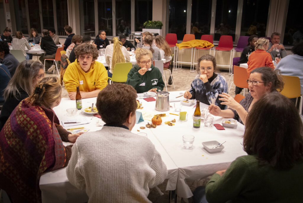En novembre, un dernier atelier aussi un peu spécial fut encore proposé. Cette fois-là, la popote a eu lieu un mercredi après-midi pour spécialement accueillir un groupe d’étudiant·es bioingénieur·es dans le cadre de leur cours à option sur la transition des systèmes alimentaires. La papote a eu lieu le lendemain avec le groupe et une septantaine de personnes au total pour la grande soirée des Equi-Tables !