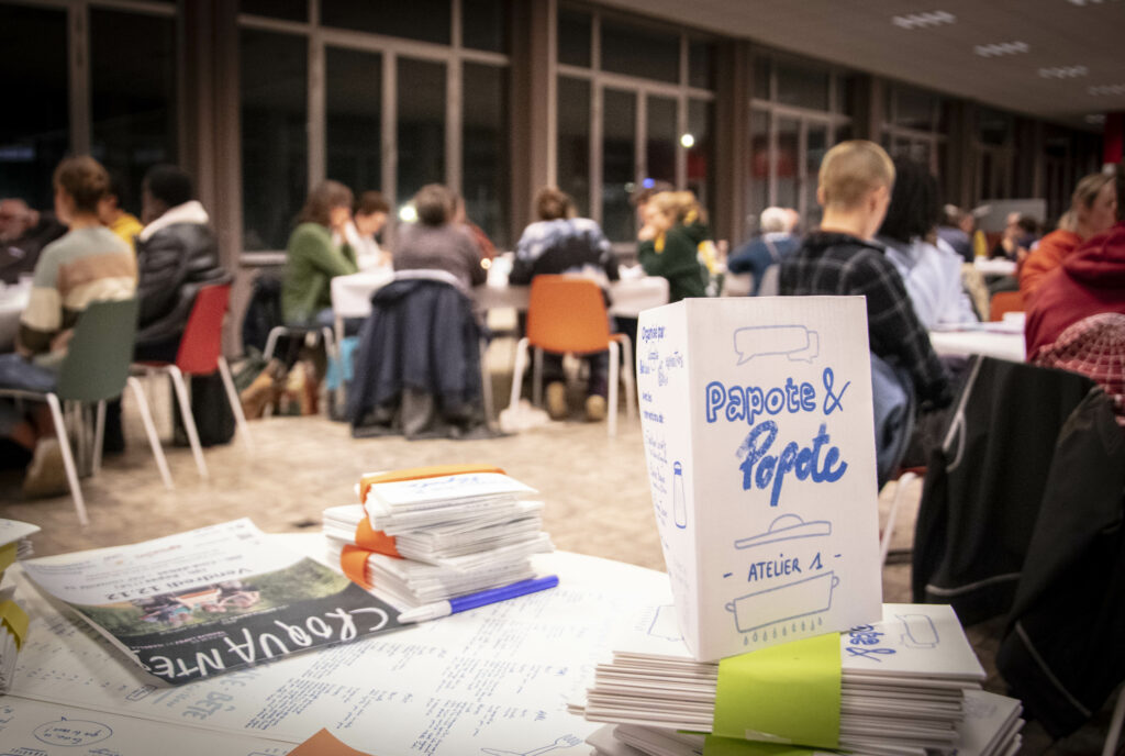des ateliers de cuisine (la popote) suivis d’un repas convivial autour d’un moment de rencontre (la papote) avec des acteurices engagé·es de notre alimentation.
